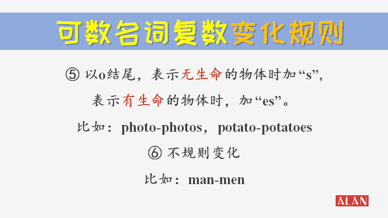 我們看到第五種規則里,是當單詞以“O”結尾時,無生命的物體可以直接加“s”, 而有生命的物體,需要加“es”。比如:圖上的單詞——photo(照片),它是無生命的物體,復數就可以直接加“s”變為photos。相反——potato(土豆),是個有生命的物體,所以要在詞末加“es”, 變為potatoes。