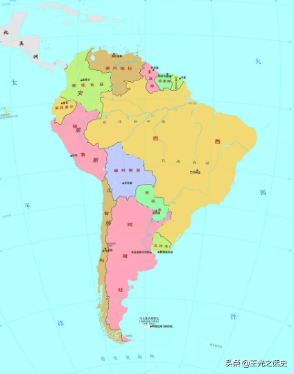 南美洲國家示意圖。南美洲面積為1780萬多平方千米,有12個獨立國家和1個法屬殖民地(圭亞那),人口約為4億