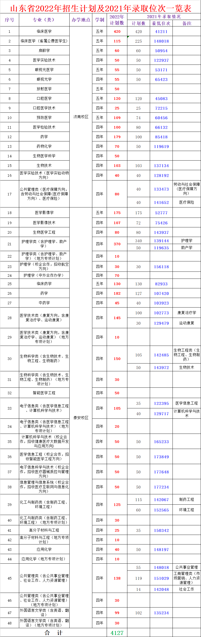 山東省內最低位次按照往年經驗,14萬名以內建議報考。五年制醫學類專業5萬名以內建議報考,醫學技術類專業9萬名以內建議報考,其他醫學相關專業14萬名左右均歡迎報考。后附山東省2022年招生計劃及2021年錄取位次一覽表。