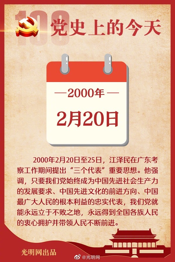 【黨史上的今天】2000年2月20日至25日,江澤民在廣東考察工作期間提出了“三個代表”的重要思想。他強調,要把中國的事情辦好,關鍵取決于我們的黨,取決于黨的思想、作風、組織、紀律狀況和戰斗力、領導水平。只要我們黨始終成為中國先進社會生產力的發展要求、中國先進文化的前進方向、中國最廣大人民的根本利益的忠實代表,我們黨就能永遠立于不敗之地,永遠得到全國各族人民的衷心擁護并帶領人民不斷前進。