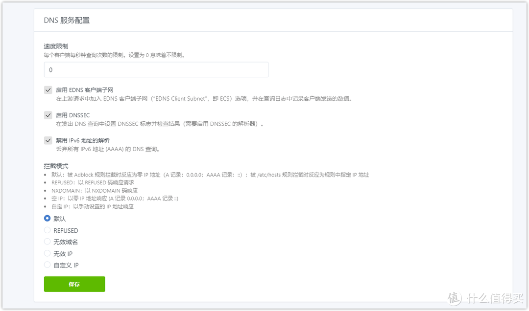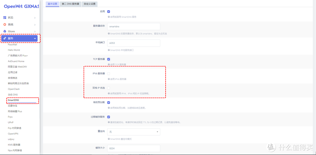 【重定向】:一定不要選擇,后面我們用Adguard Home進行重定向。還有就是一些版本的SmartDNS,沒有重定向功能,改成了自動設置 DNSMASQ,如果是這個版本注意不要點自動設置 DNSMASQ 。因為我自己是用的IPV4公網,這里IPV6的兩項設置不勾選,如果用IPV6勾選此兩項。