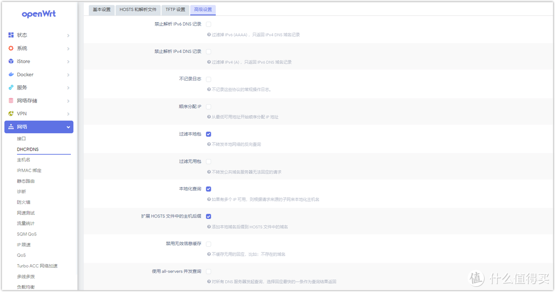 最后一步設置DNSMASQ。打開網絡——DHCP/DNS,可以看到DNSMASQ服務,主要是解除DNSMASQ的DNS功能,只保留轉發功能,讓DNSMASQ作為AdGuard Home的下級服務生效。
