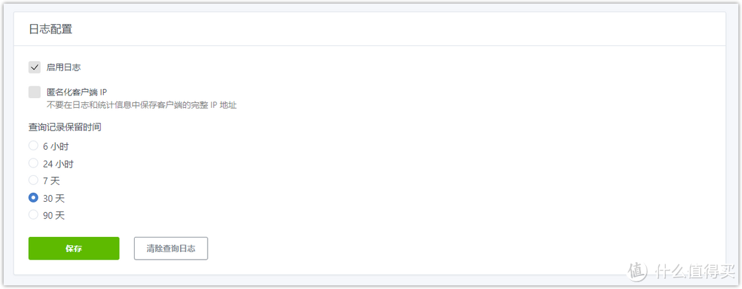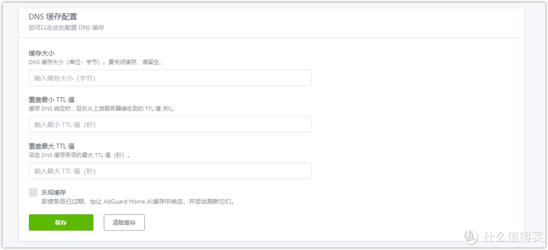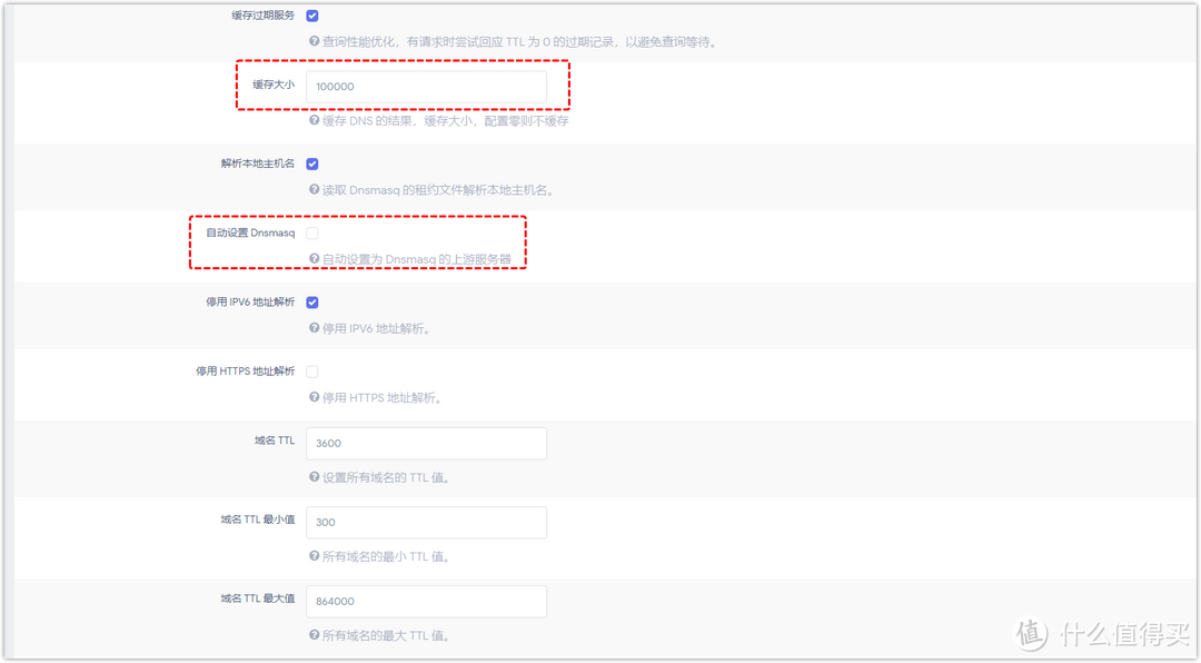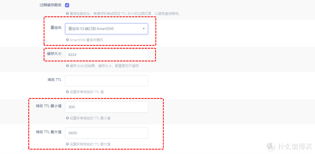 【域名TTL】:是指緩存的時間,也就是DNS在本地保留生效的時間,留空則根據上游服務器告知的時間緩存,但是如果低于最小值,則按照最小值在緩存之內防止短時間多次查詢,如果時間過長則按照最大值緩存防止失效。域名TTL可根據自己需求需求填入,最小值填入「300」、域名 TTL 最大值填入「3600」。域名TTL最大值如果我們這里填入3600,意思是緩存一個小時。同樣如果填入864000,意思就是系統會幫我們緩存十天。