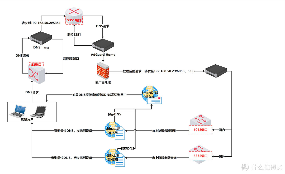 →192.168.1.1:53→192.168.2.1:53(DNSMASQ)→192.168.2.1:5351(Adguardhome)→192.168.2.1:6053 (SmartDNS緩存)→上游國內DNS公共服務器→返回最快DNS給客戶端
