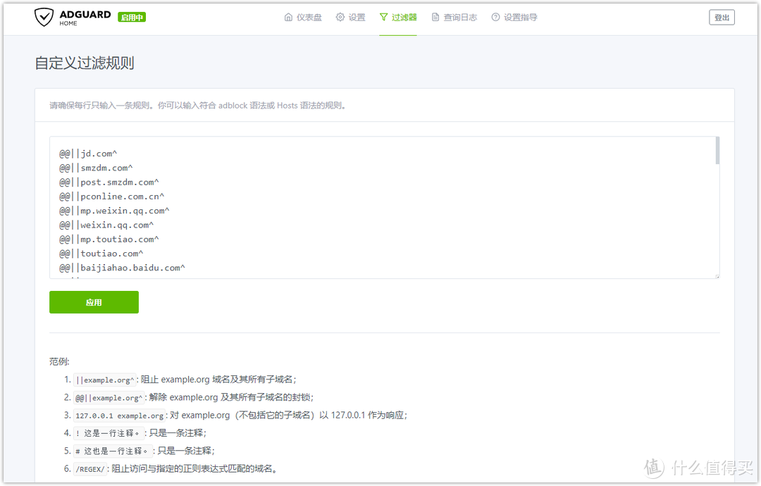比如我們要放行值得買網站及其子域名,只要添加一行代碼就可以了,用于訪問個別網站時候有BUG時快速添加。