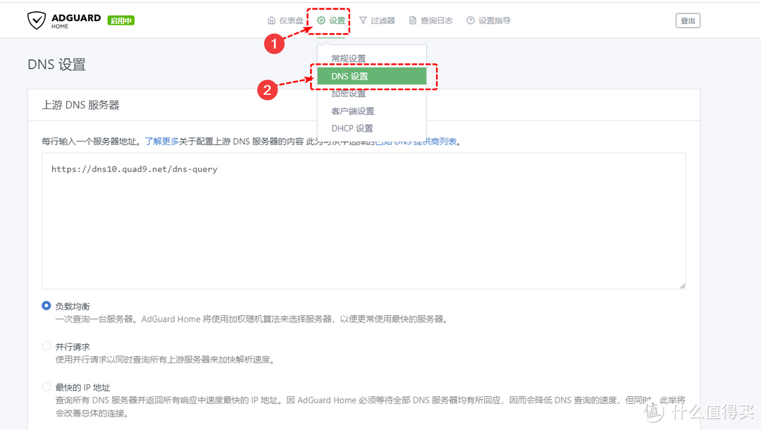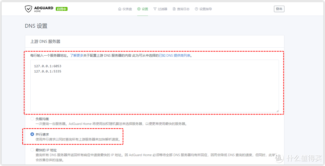下面DNS的查詢方式有負載均衡、并行請求、最快的IP地址三種,樓主還是建議選擇并行請求,上面我們設置過了DNS全部放到了smartdns里面緩存,Adguardhome會向smartdns緩存庫里并行查詢,smartdnsDNS本身具有返回最快dns的功能,也會向Adguardhome返回最快的DNS。
