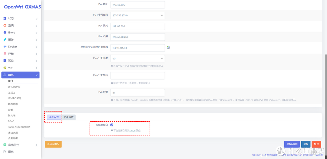IPv4網關:指向ikuai的網關。保證OpenWrt的上網數據傳輸到ikuai再傳輸到外網。