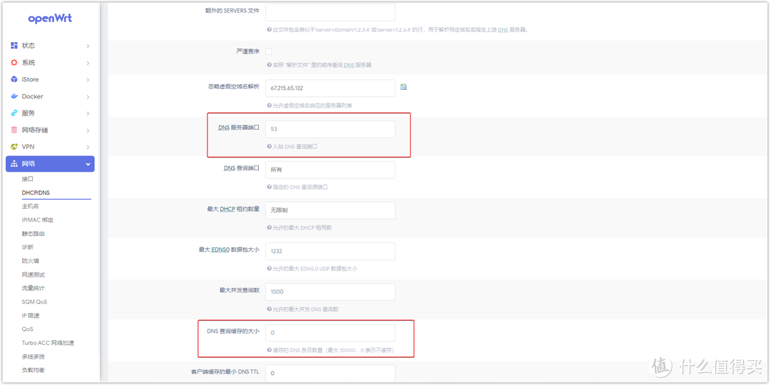 同樣在在【網絡】→【DHCP/DNS】高級設置里面DNSMASQ還是在監聽53端口。DNS 查詢緩存的大小設置為0。不使用DNSMASQ的DNS緩存。點擊保存生效。