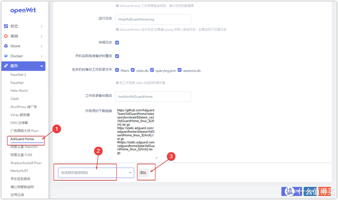 在Adguardhome的基礎設置頁面,翻到最下面,可以看到有一個功能框,選擇改變網頁登錄密碼,點添加。
