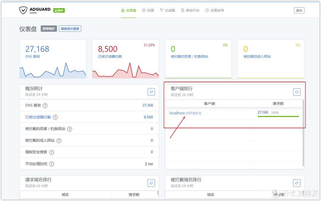 進入配置網頁,儀表盤里你會發現已經開始DNS查詢和廣告攔截了。這里我們看到客戶端攔截列表里看到的全部都是127.0.0.1 的數據。我們前面在重定向模式中選擇了【作為 DNSMASQ 上游服務器】, DNS 請求第一步經過 DNSMASQ,然后才到Adguardhome,所以Adguardhome接受到的都是53 端口的DNS請求,這時候Adguardhome自是無法區分是哪個客戶端發過來的請求,所以才出現了后臺攔截的全都是 127.0.0.1 的數據。這里小伙伴不需要糾結,影響不大,穩定第一。