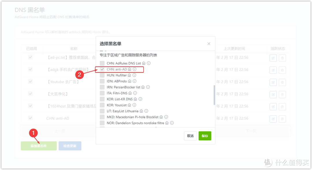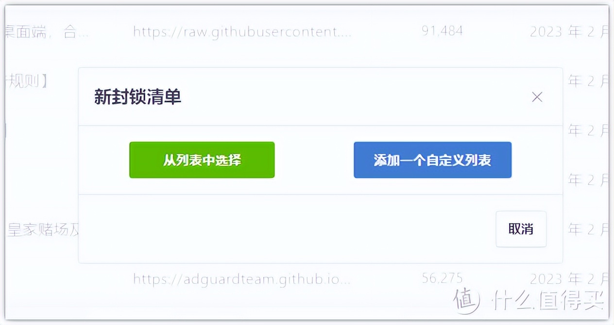 添加黑名單,這里可以從列表中添加,也可以添加自定義名單,列表中是Adguardhome收集和維護的一些名單,可以直接使用。自定義名單是從網上找一些大神為愛發電分享的名單。