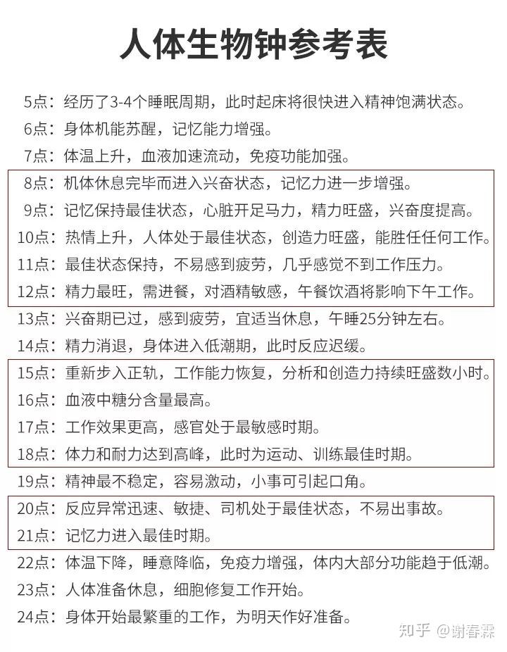 要順應生物鐘,你就得理解生物鐘,以下是我根據某位醫生列出的一張生物鐘時刻表簡化而來,方便你作為參考: