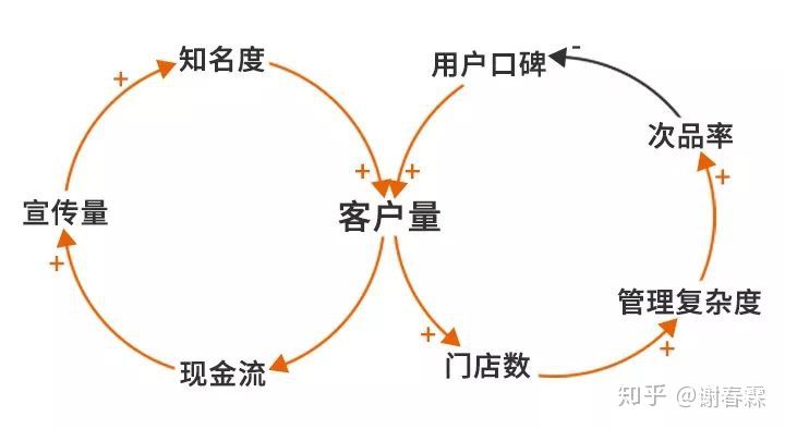宣傳量越大,奶茶店的知名度就越高,就會吸引越多的人來購買;而越多人購買,奶茶店的現金流就會變得越多,你就可以不斷拿錢去做更多的宣傳,這就形成了一個增強回路。