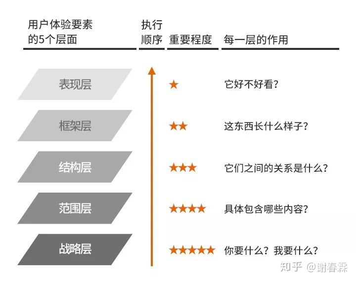 有一本書叫做《用戶體驗要素》,它是講怎么建設一個網站的,但我們可以把其中的核心框架(用戶體驗要素的5個層面)剝離出來,遷移到任何“建設類”的項目中,小到一篇文章,大到一棟大廈、一個軟件系統,你都能通過這個框架,非常清晰的看到整個建設過程中各個任務的主次輕重之分。