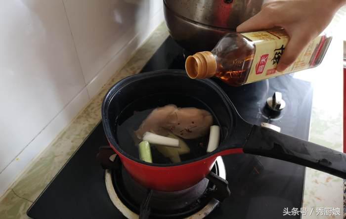 1.鍋內加水,放入雞胸肉,放入蔥段,姜片,花椒,八角,料酒大火煮開,中火燉10分鐘