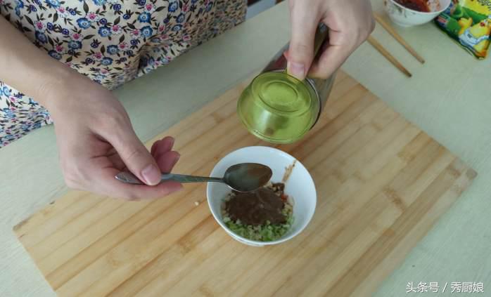 4.將花生碎,蒜粒,蔥花,芝麻醬,醋,辣椒油,味極鮮,鹽,雞精攪拌均勻