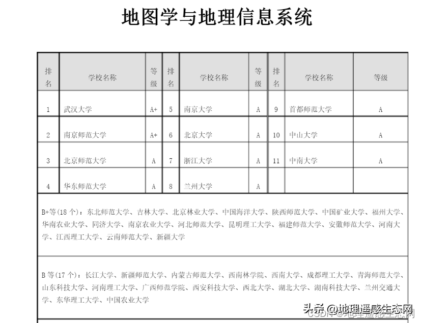 排名學校名稱評估結果1武漢大學A+2解放軍信息工程大學A+3中國礦業大學A-4北京大學B+5同濟大學B+6中南大學B+7山東科技大學B8中國地質大學B9西南交通大學B10長安大學B11遼寧工程技術大學B-12河海大學B-13河南理工大學B-14北京建筑大學C+15北京師范大學C+16東南大學C+17西安科技大學C+18東北大學C19東華理工大學C20中國石油大學C21江西理工大學C-22桂林理工大學C-23昆明理工大學C-