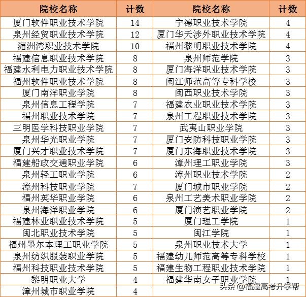 招生專業最多的院校是廈門軟件職業技術學院,共有14個專業面向中職類考生招生。