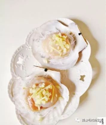 4 把剩下的一半蒜蓉分放在每個扇貝肉上,再放上姜絲。