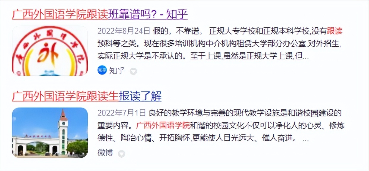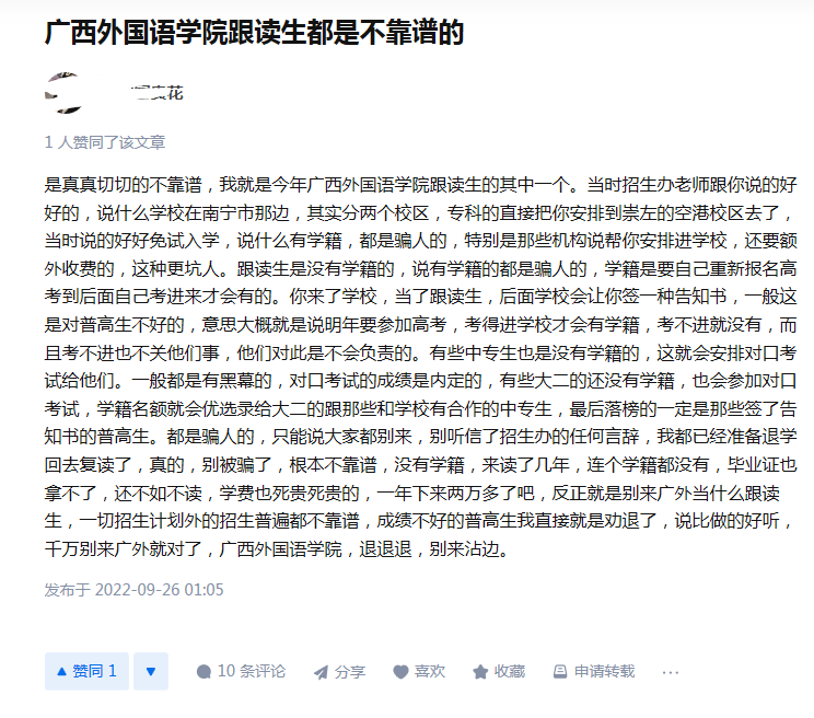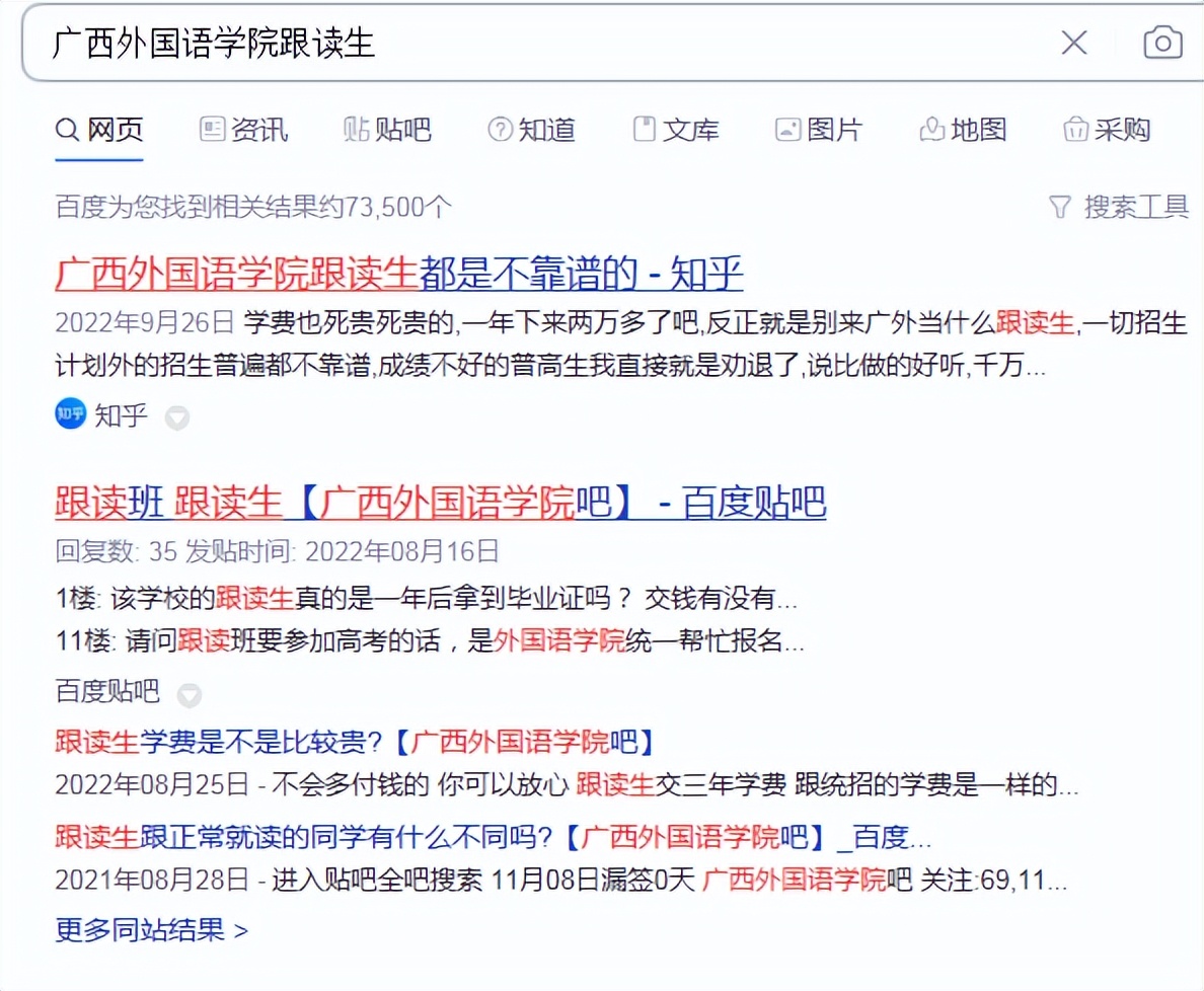 通過網上搜索“跟讀生”,跟讀生不是一個新鮮的概念,早年就有出現,多所高職高校有招錄跟讀生。而且在網上有多名自稱廣西外國語學院招錄的跟讀生,表示“被騙了”。