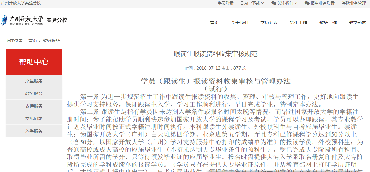 廣州開放大學實驗分校也在2016年發布了《學員(跟讀生)報讀資料收集審核與管理辦法(試行)》,跟讀生是指有學員因未達到入學條件或報名時間太晚等情況,而錯過國家開放大學的學籍注冊時間;為了能幫助學員順利快速參加國家開放大學的課程學習及考試,學員可以辦理跟讀,其專業教學計劃及畢業時間按正式學籍注冊時間執行。本科跟讀生分續讀生、外校預科生與自考應屆畢業生。