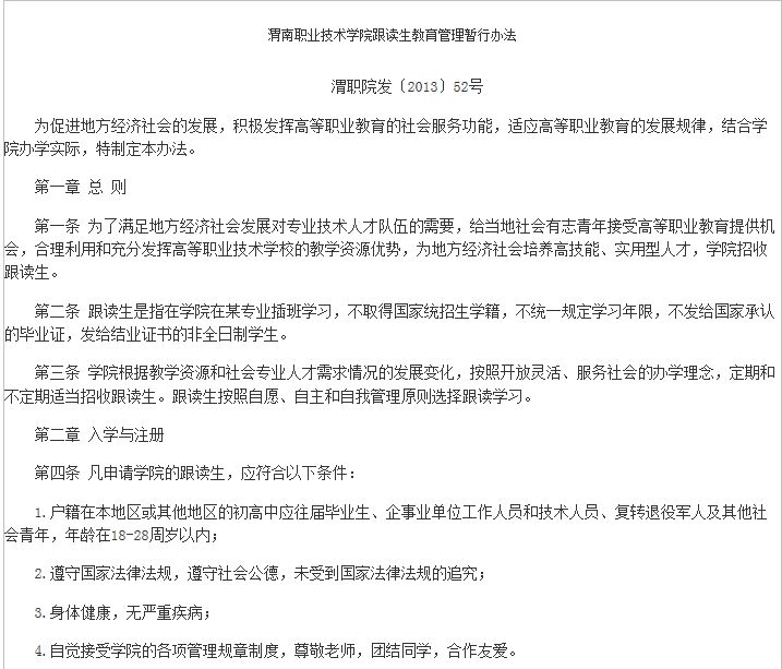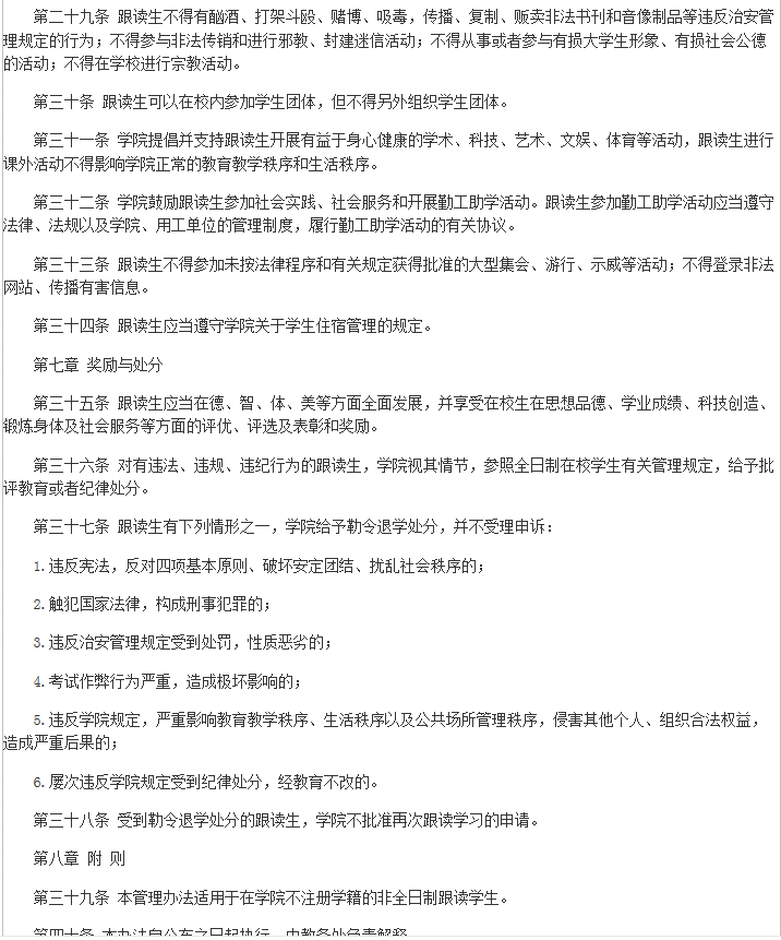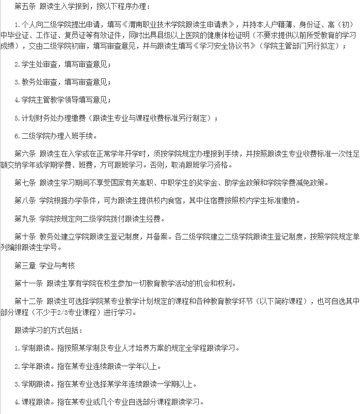 我看到了一篇渭南職業技術學院在2013年發布的《渭南職業技術學院跟讀生教育管理暫行辦法》,渭南職業技術學院作為公辦高職院校,關于跟讀生有關規定很詳細,我們可以從中作出一些了解。如,跟讀生是指在學院在某專業插班學習,不取得國家統招生學籍,不統一規定學習年限,不發給國家承認的畢業證,發給結業證書的非全日制學生。跟讀生學習期間不享受國家有關高職、中職學生的獎學金、助學金政策和學院學費減免政策。跟讀生按照學制修業期滿,所修課程考核全部合格;或修滿一學年,所修課程考核全部合格的,學院發給結業證書,發證日期按結業時間填寫。未修滿一學年,或受到學院勒令退學處理的,不發給結業證書(可發給學習證明)。