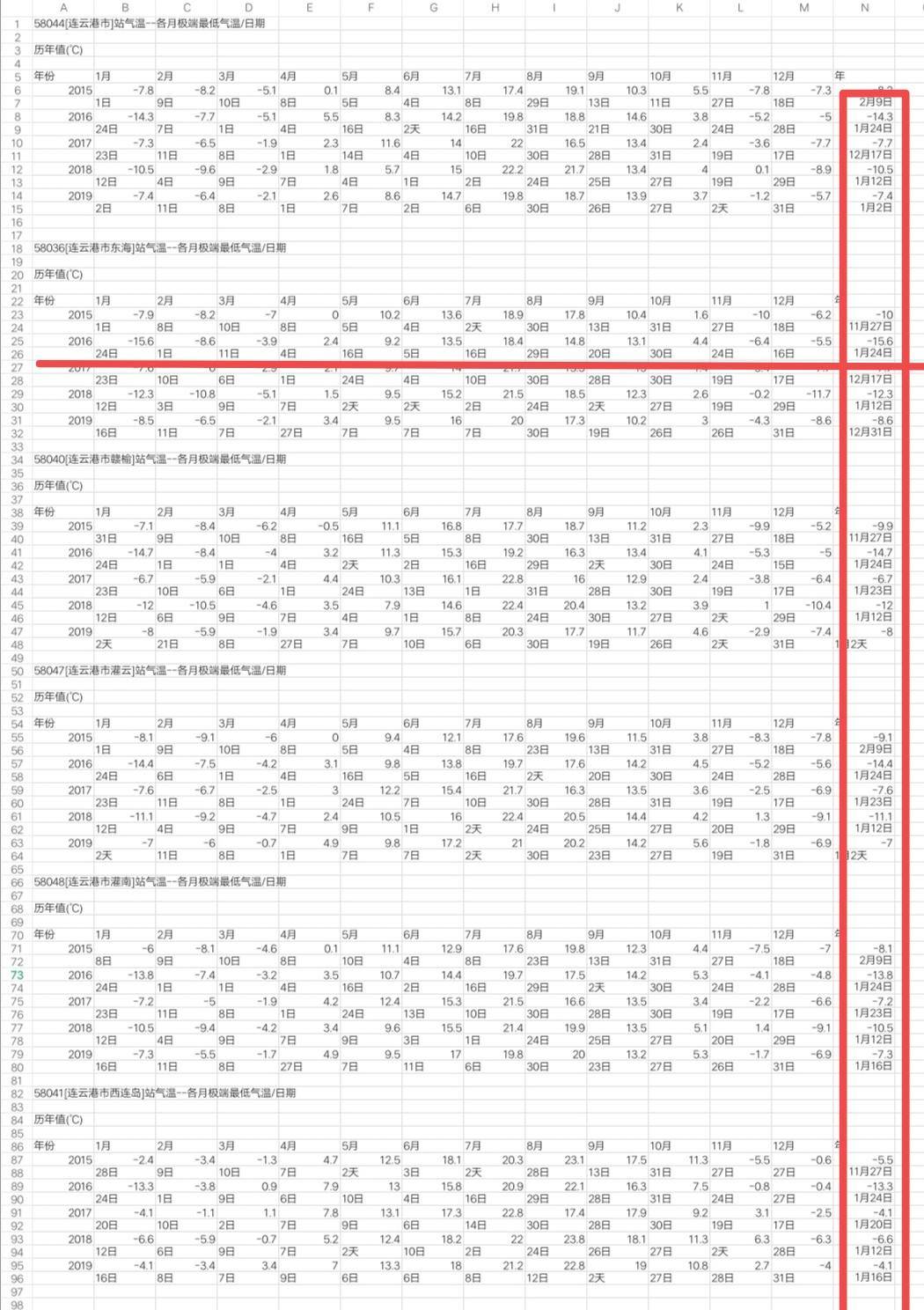 東海縣氣象臺昨天中午發布寒潮藍色預警信號,預計未來48小時東海縣大部分地區最低氣溫將下降8℃左右,其中15日早晨最低氣溫在-9℃左右, 創下今年入冬以來氣溫新低。記者還從連云港市氣象局調閱了該市近6年來極端最低氣溫發現:極端最低氣溫出現在2016年,全市極端最低氣溫發生在東海縣,當年1月24日該縣最低氣溫達到-15.6°。