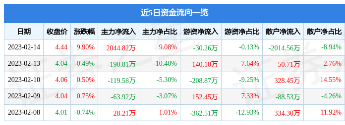 2月14日的資金流向數據方面,主力資金凈流入2044.82萬元,占總成交額9.08%,游資資金凈流出30.26萬元,占總成交額0.13%,散戶資金凈流出2014.56萬元,占總成交額8.94%。