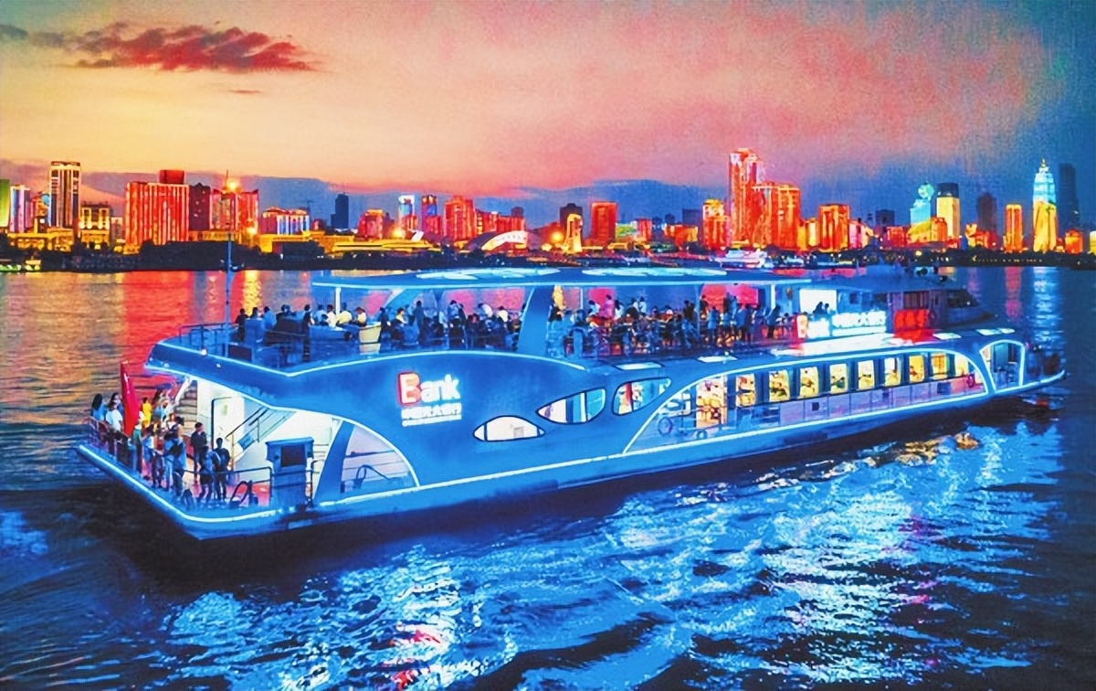 上圖:武漢長江江面上游輪載著中外游客以及武漢市民夜游長江。