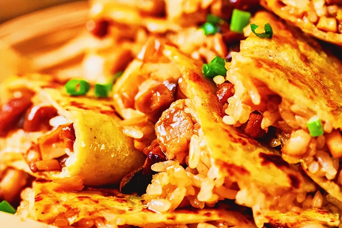 上圖:武漢著名美食三鮮豆皮以糯米和豆皮加鮮肉鮮蛋菇筍做餡而成。
