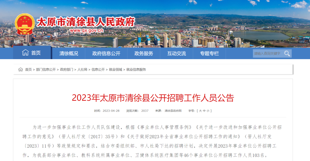 為進一步加強事業單位工作人員隊伍建設,根據《事業單位人事管理條例》《關于進一步改進和加強事業單位公開招聘工作的意見》(晉人社廳發〔2017〕35號)和《關于做好2023年全省事業單位公開招聘工作的通知》(晉人社廳發〔2023〕11號)等政策規定和要求,結合太原市委組織部、市人社局下達的招聘計劃,決定開展2023年事業單位公開招聘工作,為清徐縣部分事業單位、教科系統所屬事業單位、衛健體系統醫療集團等46個事業單位公開招聘工作人員103名。