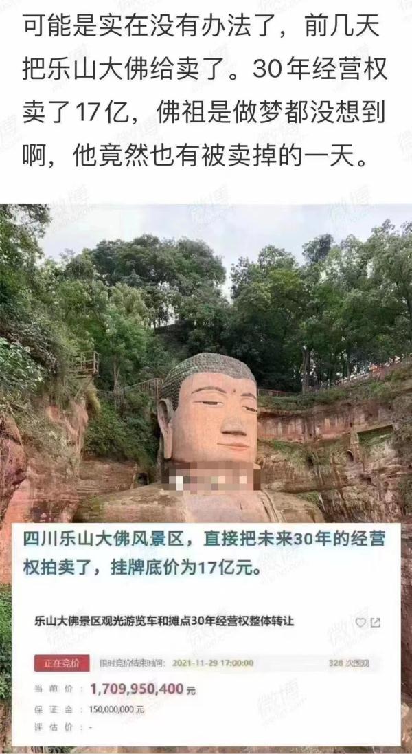 該消息稱,“前幾天把樂山大佛給賣了。30年經營權賣了17億,佛祖是做夢都沒想到啊,他竟然也有被賣掉的一天。”