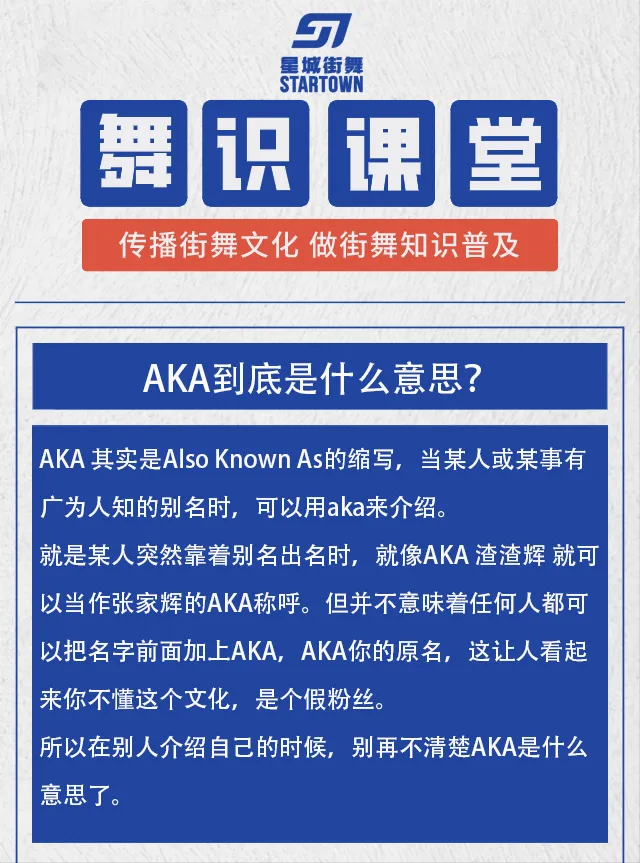 就是某人突然靠著別名出名時,就像AKA渣渣輝就可以當做張家輝的AKA稱呼。但并不意味著任何人都可以把名字前面加上AKA,AKA你的原名,這讓人看起來你不懂這個文化,是個假粉絲。