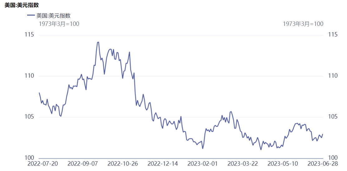 此外,當地時間6月28日,美聯儲主席鮑威爾在葡萄牙辛特拉舉行的歐洲央行研討會上表示,多數決策者預計今年將再加息兩次,且不排除連續加息的可能性。此番鷹派發言使得市場對美聯儲加息預期抬升,加上美國政府債務上限危機等,短期內美元指數走強,對人民幣匯率形成被動貶值壓力。