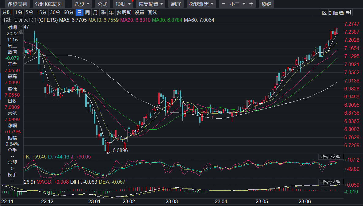 不過,這一反彈勢頭并未延續下去。6月28日,在岸和離岸市場雙雙大跌,在岸人民幣對美元匯率盤中跌破7.25,離岸人民幣一度逼近7.27,均創下2022年11月以來的新低,日內貶值幅度近400基點。當日在岸人民幣對美元匯率報收7.2455,離岸報收7.2431。