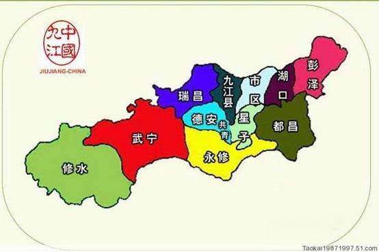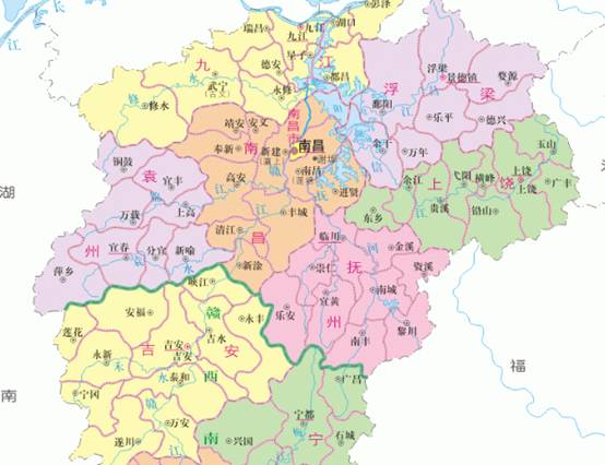 比如這幅老的江西地區,大家看看上面的九江,出現了三次,這里面紅字九江表示的是“九江地區”,紅色圓圈那個九江指的是九江市,而旁邊的九江指的則是九江縣