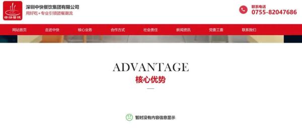 在中快餐飲官網,發展歷程、核心優勢、項目展示、合作方式、公司動態等內容均已被刪除,僅留下黨委工委內容。