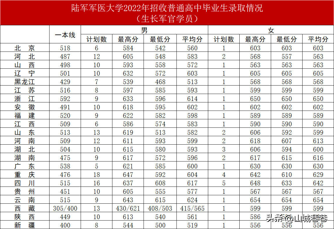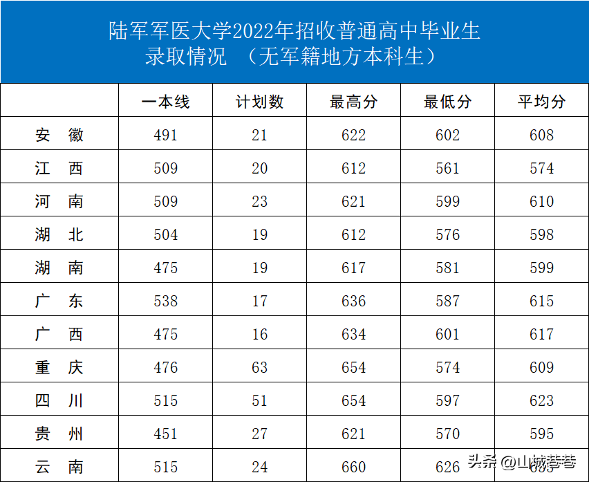二、陸軍軍醫大學2022年在各省錄取分數線