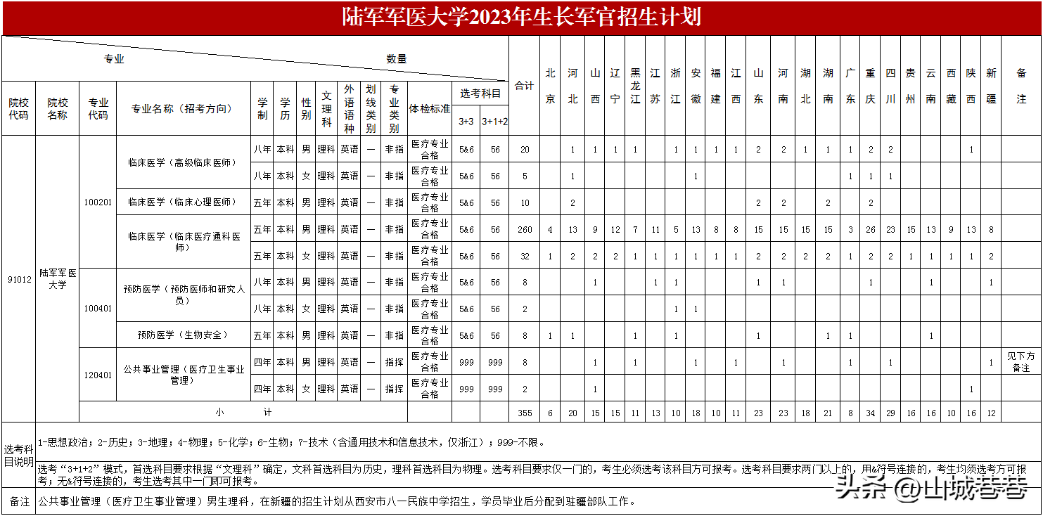 2023年陸軍軍醫大學招收生長軍官學355人,比2022年增加了103人,一共招收女生41人、男生314人,均為理科(物理類)。