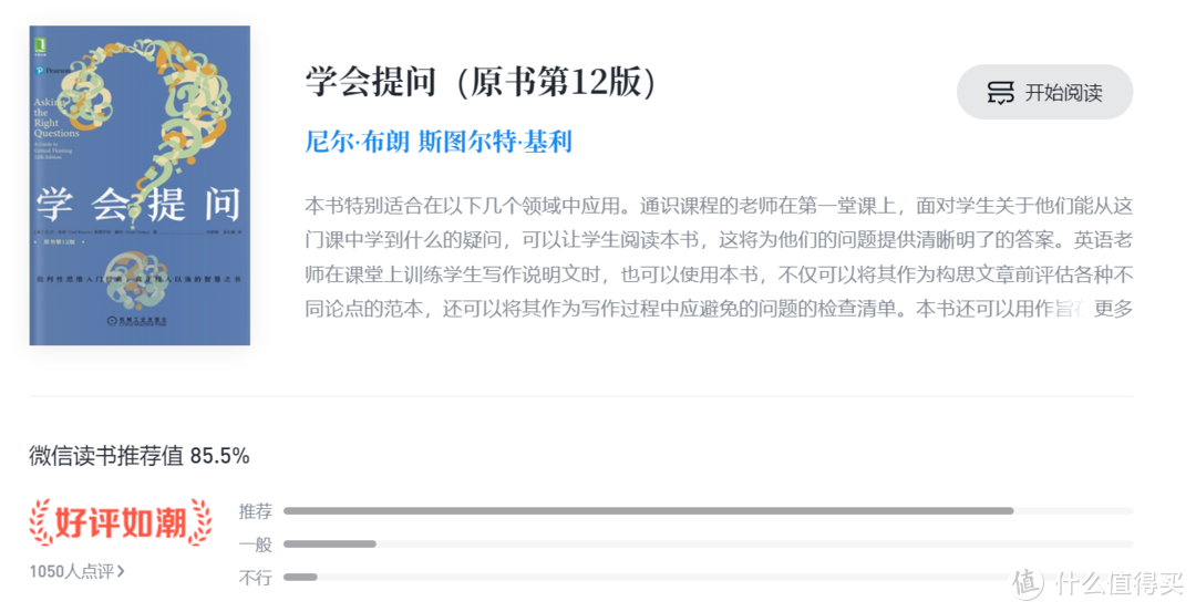 尼爾·布朗與斯圖爾特·基利的《學會提問》。這本書不是我今年所有書籍中覺得最值得一讀的書,但是我認為這本書應該放在最前面,為什么?因為面對繁雜的信息,首先應該具有批判性思維。有了批判性思維打底,面對各種各樣書籍和網絡上不同的聲音的時候,才能做到獨立思考,從其中提取出真正有效的知識。