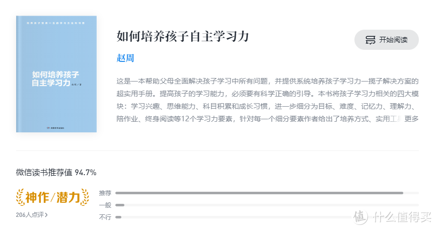 這本書是在長輩讓孩子識字、學英語后,孩子最初的新鮮感過去后,開始乏味的時候讀的,目的就是讓孩子能更有動力學習。作者通過一個包子模型,將孩子的學習能力分解成了學習興趣、思維能力、科目積累與成長習慣4個方面,又對每個方面進一步細化。理論與實際事例結合,方法與具體手段并舉,詳細講述了如何提升孩子的自主學習力。還附帶了許多小工具、小游戲用以提升孩子興趣。另一方面來說,文中提及的很多內容,其實也不止適用于孩子,反推到家長身上,用來提升家長自己的學習力也非常實用。對我自己來說,閱讀這本書感覺與之前看的很多自我提升類書籍有共鳴,能聯系,相互印證。