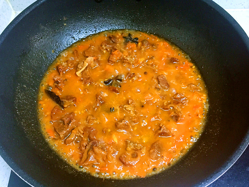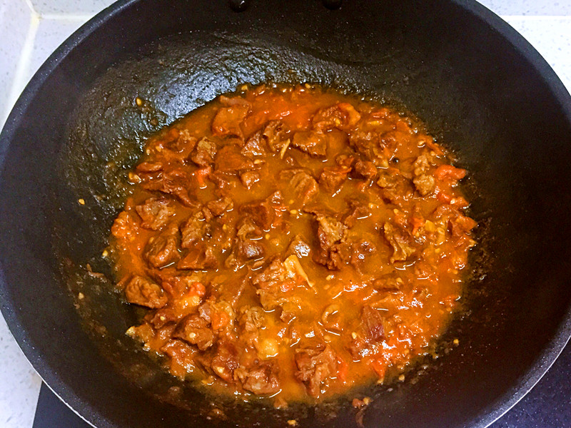 8、把燉好的牛肉連湯一起倒入,煮三四分鐘,調入鹽和少許白糖。