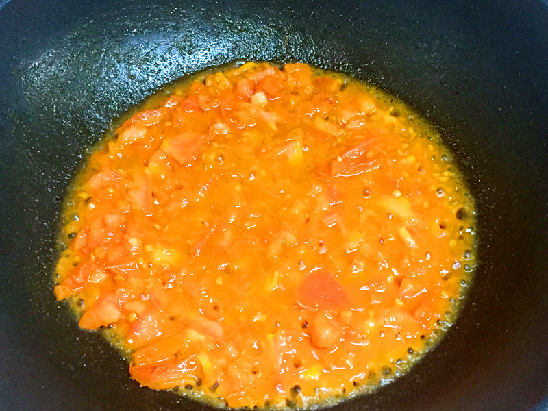 7、炒鍋洗凈后,再次注入少量油,放入切碎的西紅柿炒成蓉,注意要小火。