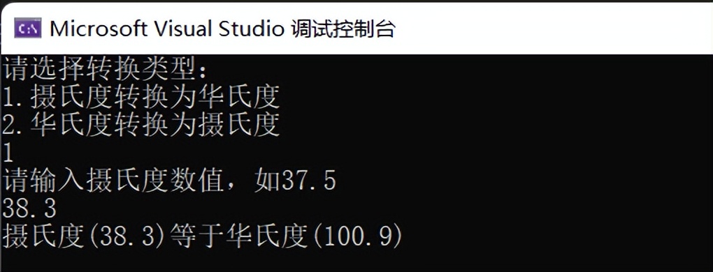 導讀本實例提供了C語言控制臺交互功能,程序啟動時向屏幕輸出,展示一個可選的溫度轉化菜單,菜單包含兩項內容,一項是將攝氏度轉換為華氏度,另一項是將華氏度轉換為攝氏度。用戶通過輸入數字1或2進行選擇溫度轉換的