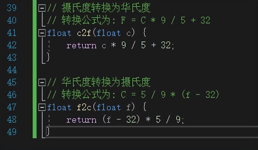 程序代碼實現上,轉換功能通過兩個函數c2f和f2c實現。c2f實現了攝氏度轉換為華氏度;f2c則實現了華氏度轉換為攝氏度。代碼描述如下圖2所示。