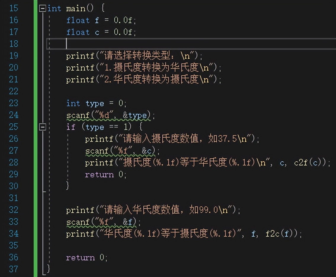 程序的交互流程是在main函數中實現,main函數首先定義了兩個浮點型變量f和c,分別用以存儲用戶輸入的華氏度和攝氏度數值,另外在第23行定義了一個變量type,它是用以存儲用戶的輸入選項:1或者2。程序執行時,scanf函數會將type變量進行賦值,if語句使用了type的數值進行判斷當前程序需要執行的是哪一種溫度轉換,如果是選項1,則進行攝氏度向華氏度轉換;否則進行反向轉換。