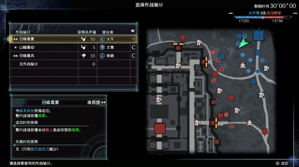 當玩家操控角色提升等級獲得稱號后即可解鎖秘計,秘計分為作戰秘計和戰場秘計兩種,作戰秘計需要玩家在戰斗準備環節進行選擇,決定所使用作戰秘計后戰場就會隨機刷新出任務,完成類似“占領X個據點”、“在X個據點內找到XX兵長”的任務后秘計布置就算是成功了。隨后戰場就會出現僅對敵軍有效的毒霧、火海等仙術,除了仙術外還可以煽動山賊暴動、求助援軍、召喚雷熊等幻獸。