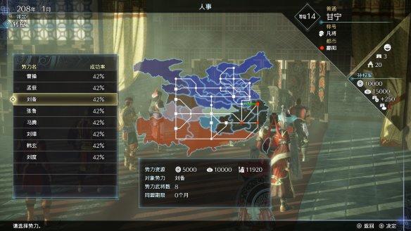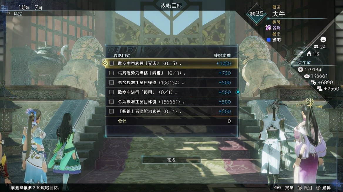 政略指令可以分為內政、人士、外交、軍事等八大項,內政影響財政及兵糧,人事可以調動兵力、為武將封官,外交用于結盟和挖角其他勢力武將,軍事能征兵為武將補充兵力,在這些政略中玩家每個月可選擇一項指令。著重說下指令中的散步,選定此指令后玩家可以和城內的武將進行對話提升好感度(無論武將是否在野),當好感度提升至S時會觸發告白(僅異性)或結義劇情。