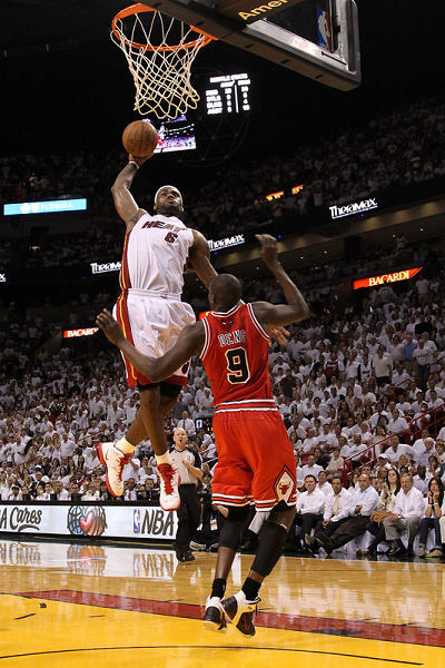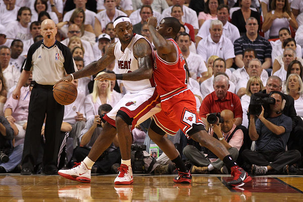 而第四戰中,兩隊從一開始就將防守放在了第一位,可是這并不妨礙比賽的精彩。在韋德和詹姆斯的夾擊之下,公牛頭號球星羅斯前三次出手都沒能命中,不過熱隊打了8分鐘也才有兩次運動戰得分。爵士舊將布澤爾和布魯爾里應外合,迅速幫助公牛以19比8取得領先。經過暫停調整之后,小皇帝詹姆斯爆發,單人打出一個8比0的攻擊波,將比分追到只差3分。接下來雙方的比分一直處于焦灼狀態,末節公牛本有絕殺對手的機會,可是羅斯搶投不中,雙方不得不進入加時賽。加時賽中,當公牛重點布防詹姆斯和韋德的時候,波什又成為熱火的功臣,他連投帶罰拿下4分,幫助熱隊迅速將比分拉開,最終公牛以93比101客場飲恨。