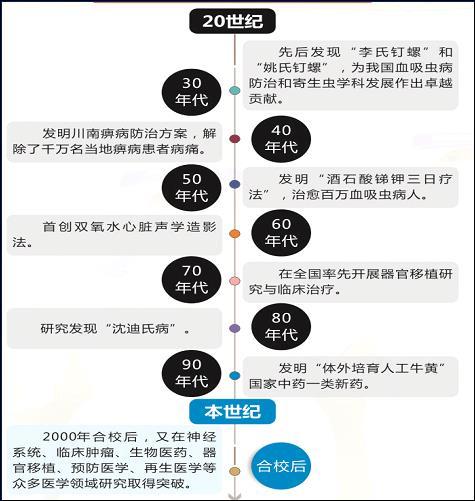 ——堅守“萬人之醫”理念。建院之初,醫學院就定位于“不要做一人之醫,要做萬人之醫”的理念,長期以來,同濟人的血液里始終流淌著創新的基因。20世紀30年代先后發現“李氏釘螺”和“姚氏釘螺”,為我國寄生蟲學研究作出卓越貢獻;40年代,找到了流行于川南的痹病防治辦法,獲得民國政府教育部全國應用科學類學術發明一等獎;50年代,發明血吸蟲病“酒石酸銻鉀三日療法”,治愈了500多萬患者;60年代率先在我國發現胎心超聲反射,并首創雙氧水心臟聲學造影法;70年代在全國率先開展器官移植研究與臨床實驗,成立全國首家器官移植研究所;80年代在世界上首先發現“新型血小板聚集功能缺陷癥”,被醫學界命名為“沈迪氏病”;90年代發明國家中藥一類新藥“體外培育牛黃”。2000年合校以后,在基礎醫學、臨床醫學、預防醫學、藥學、轉化醫學等眾多領域取得新突破。不同時期取得的重大標志性成果,猶如一面面光輝的旗幟,飄揚在醫學的高峰。